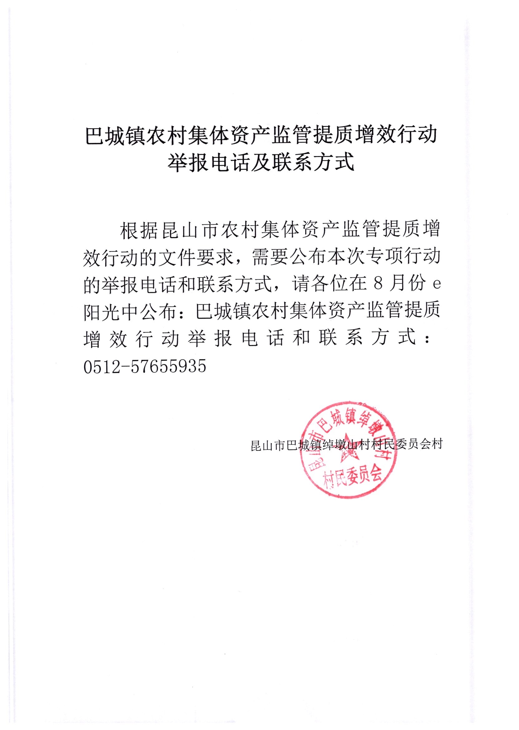 巴城鎮(zhèn)農(nóng)村集體資產(chǎn)監(jiān)管提質(zhì)增效行動(dòng)舉報(bào)電話及聯(lián)系方式