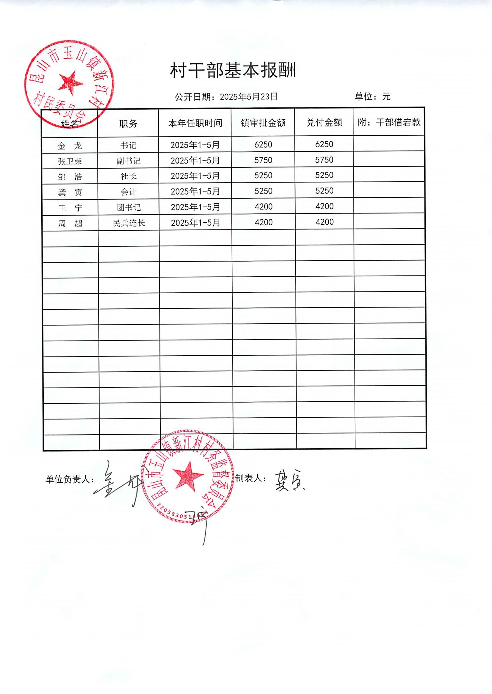 新江村2025年1-5月村干部基本報(bào)酬公示