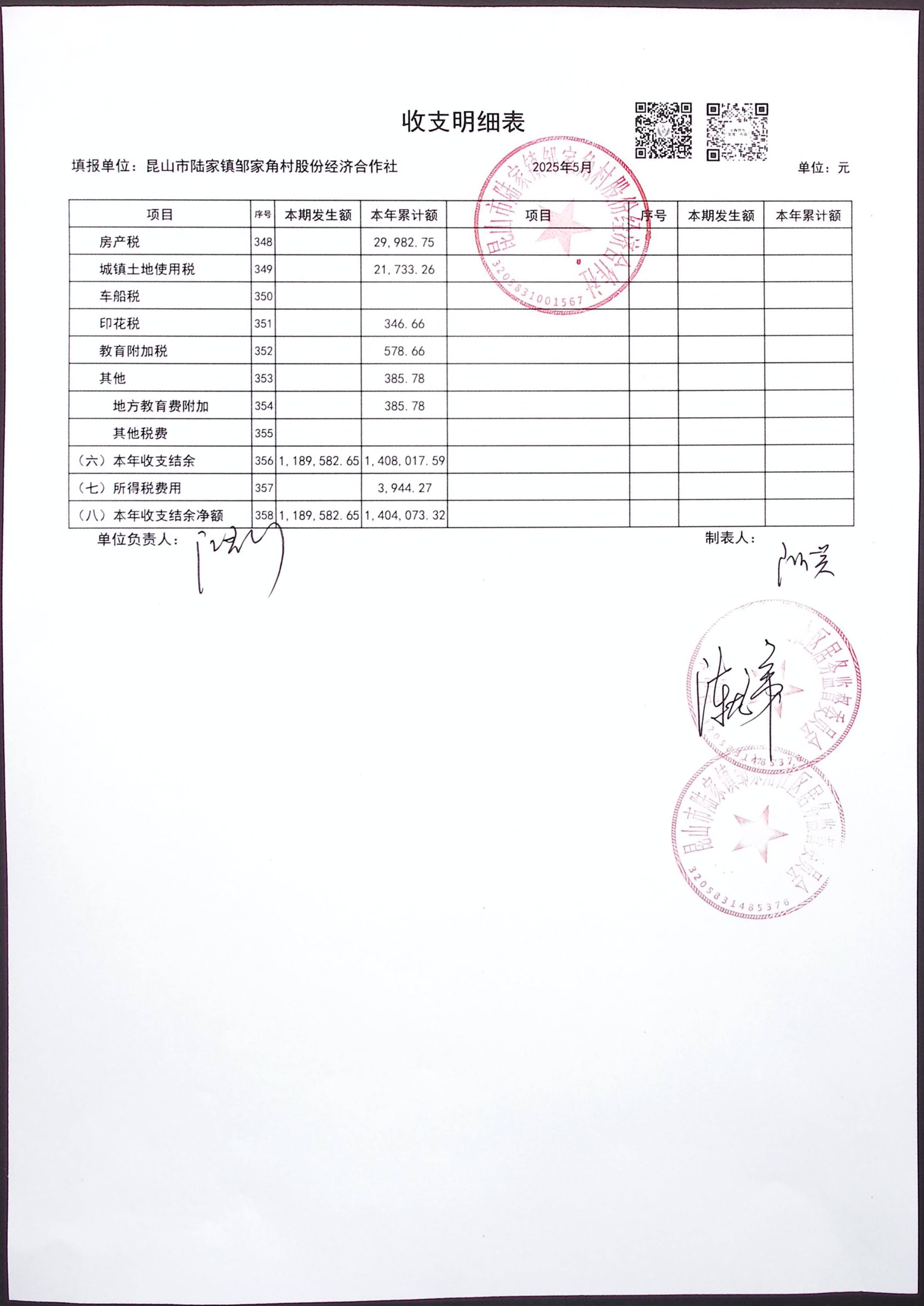 鄒家角村股份經(jīng)濟合作社2025年5月份財務公開
