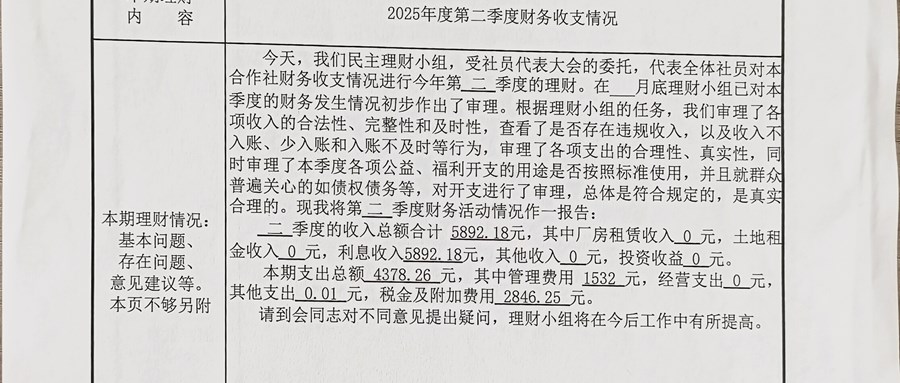 星浜村股份經(jīng)濟(jì)合作社2025年度第二季度民主理財
