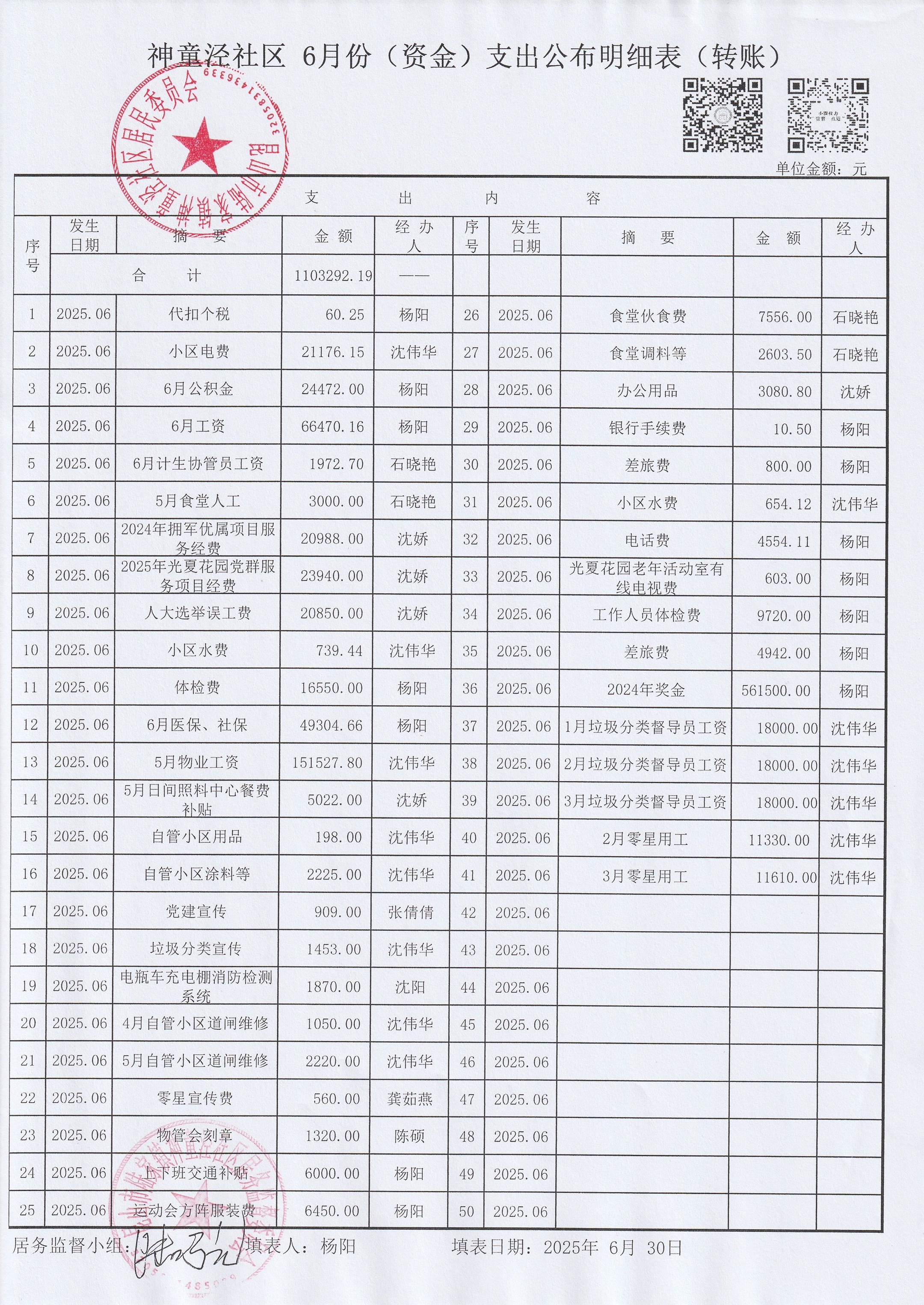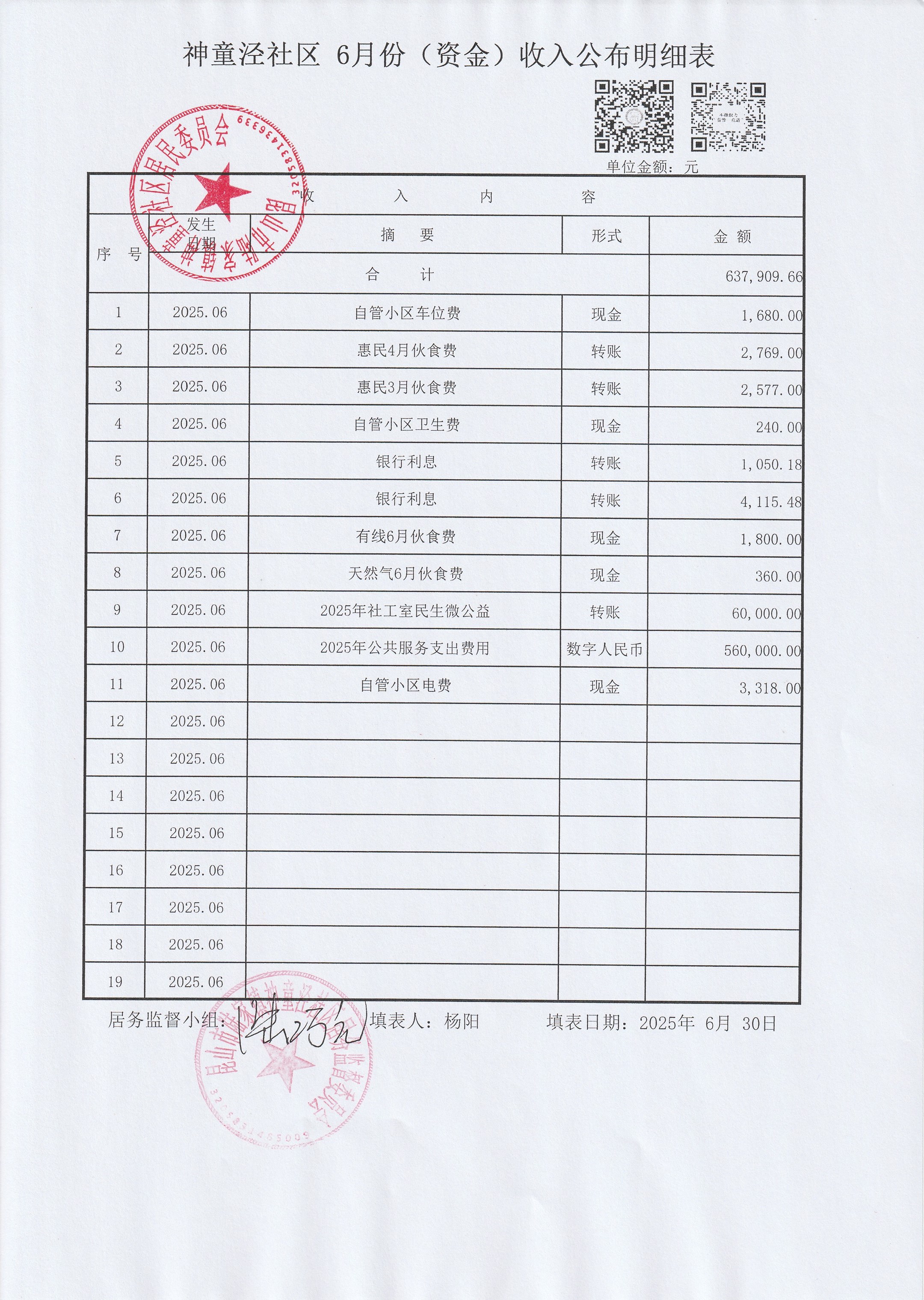 神童涇社區(qū)居民委員會6月份(資金)收支公布明