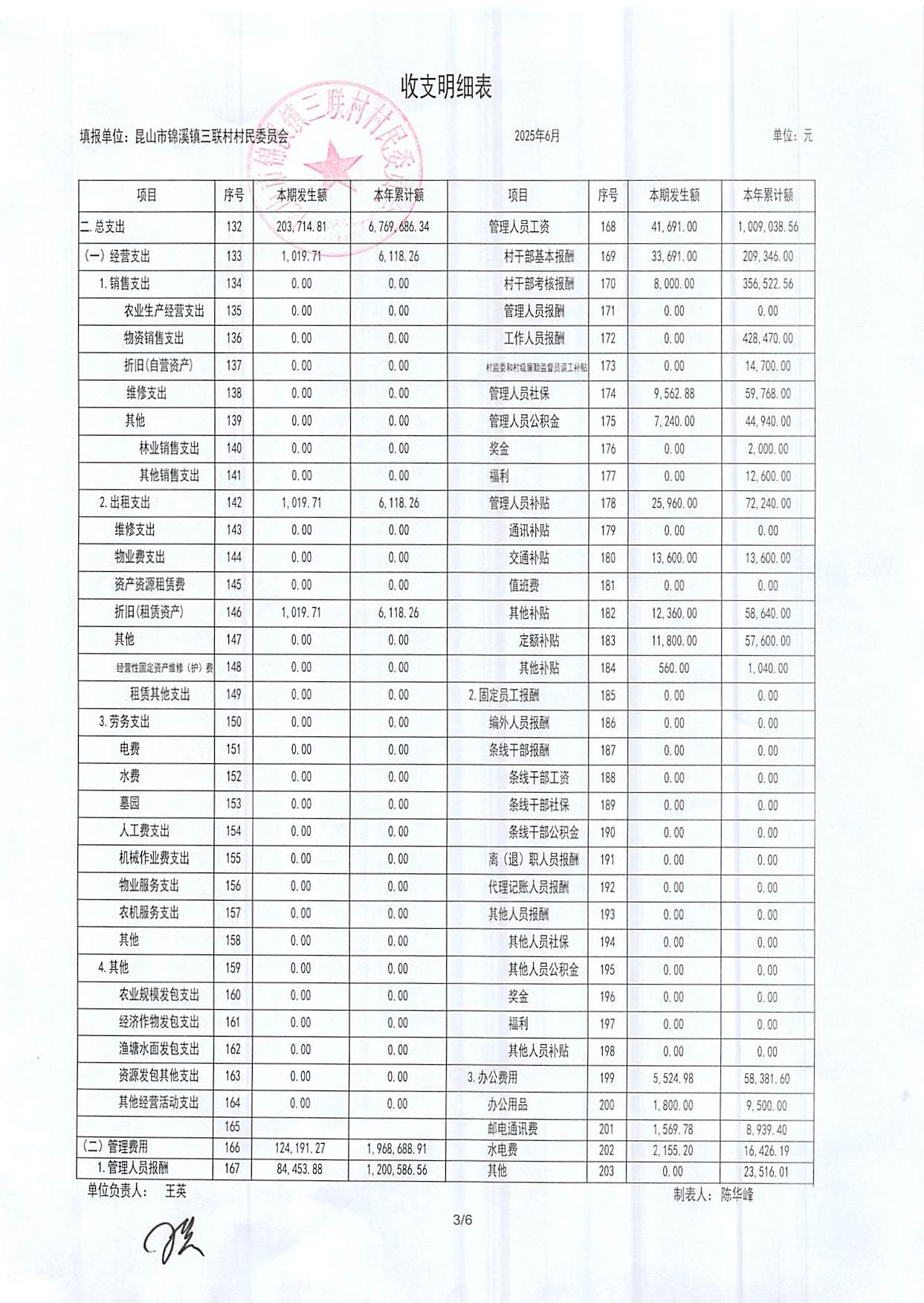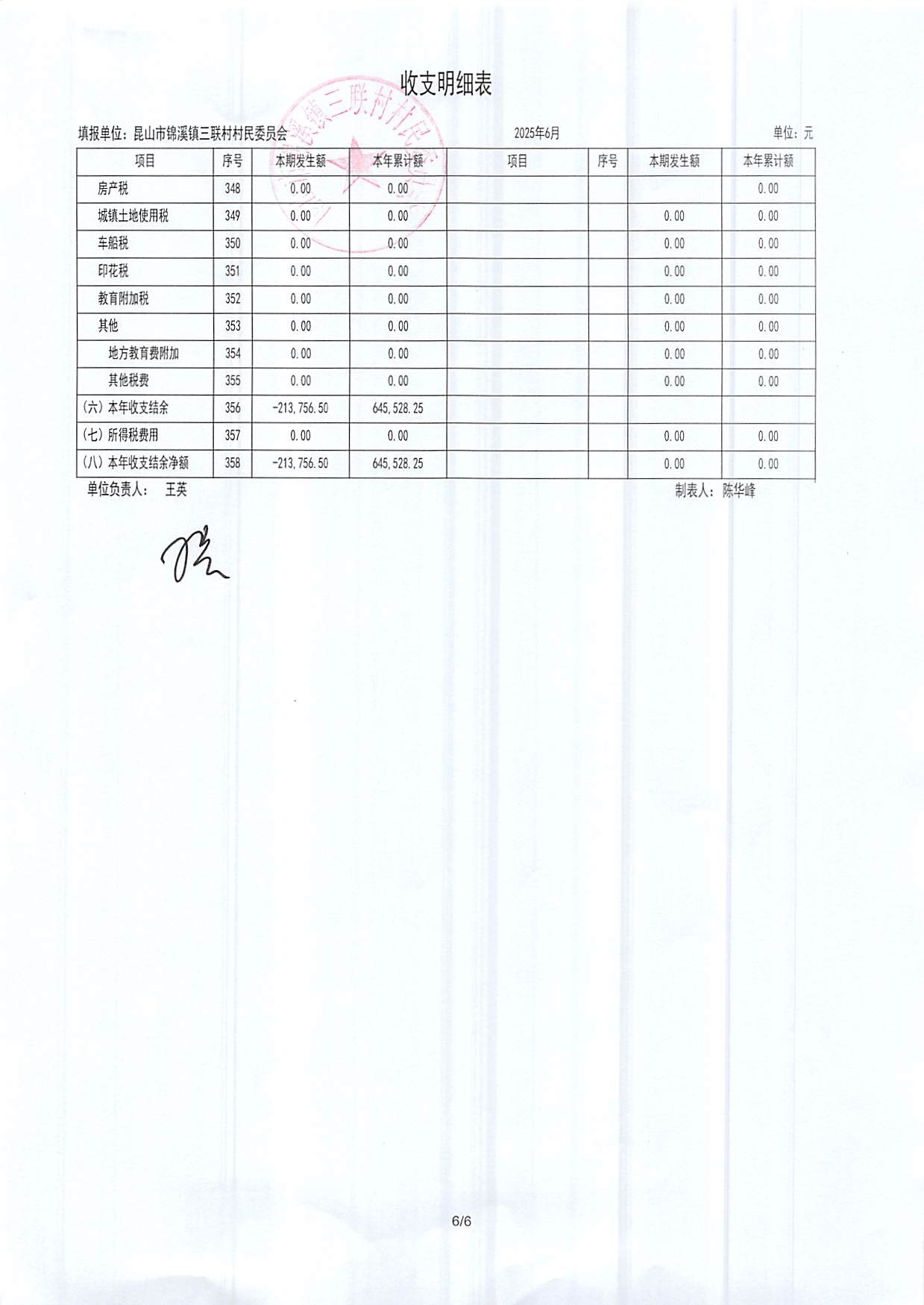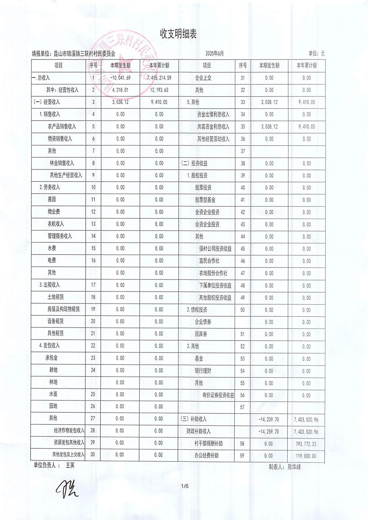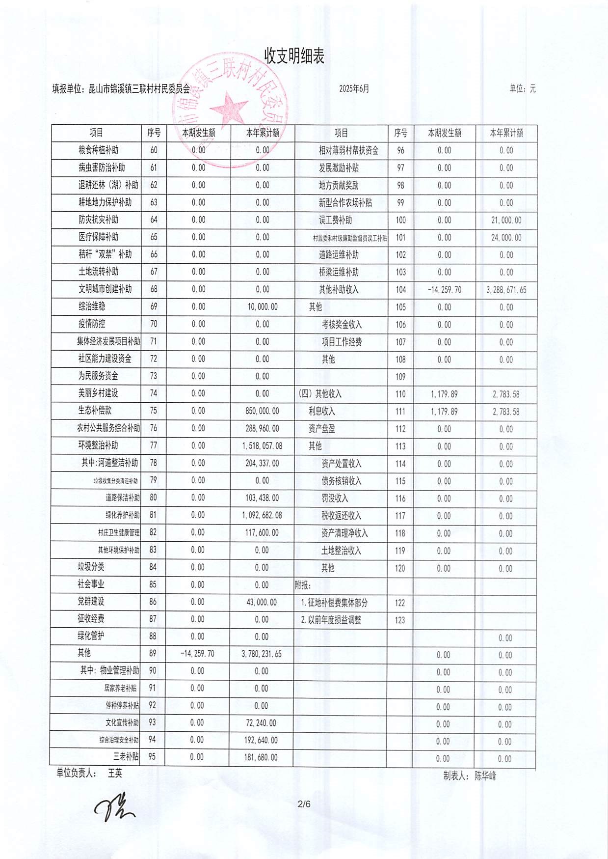 2025年三聯(lián)村村委會6月份財務(wù)公開