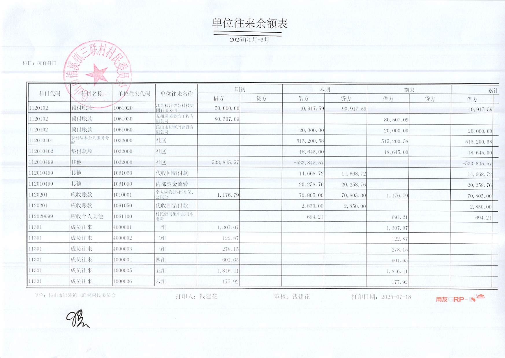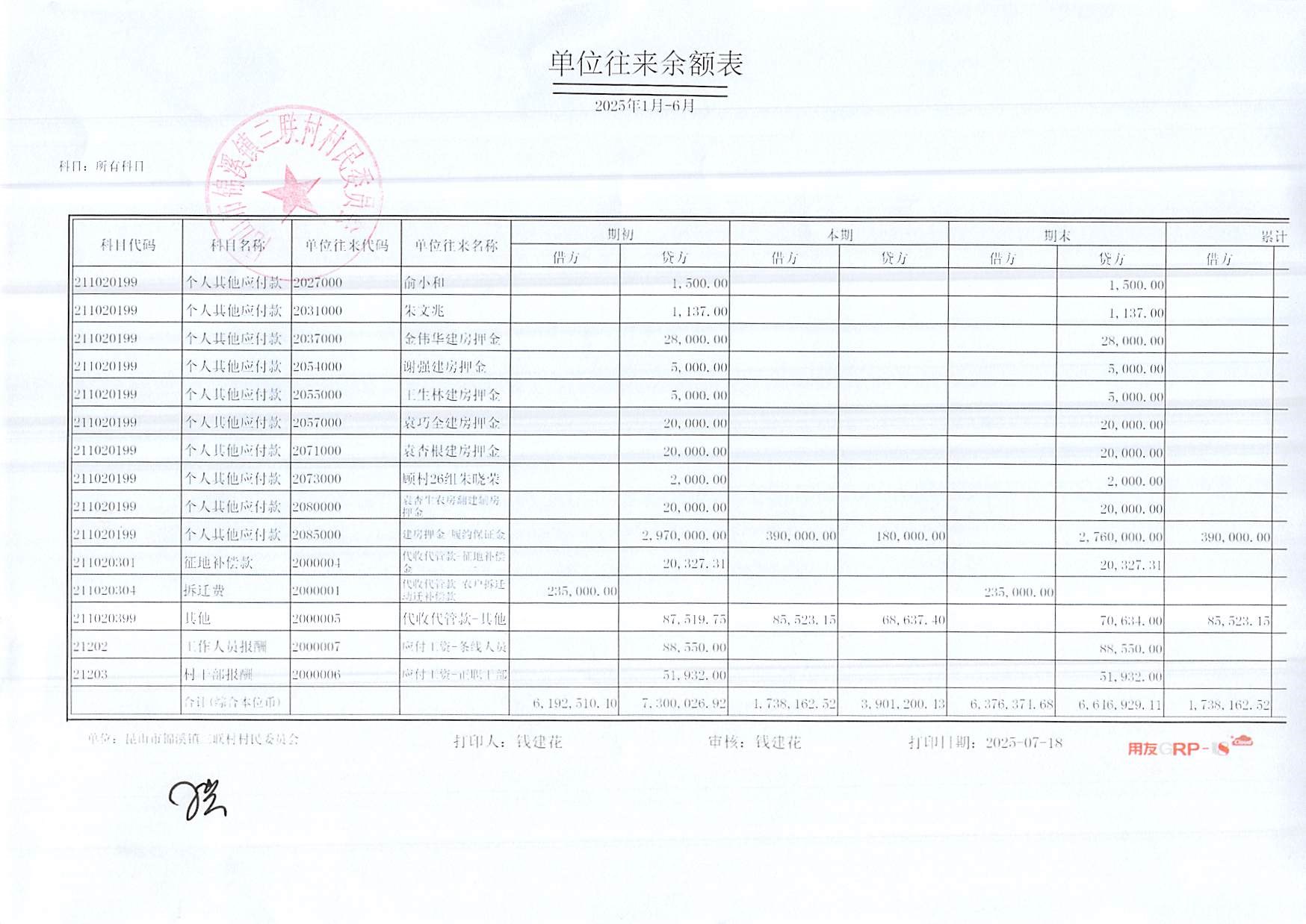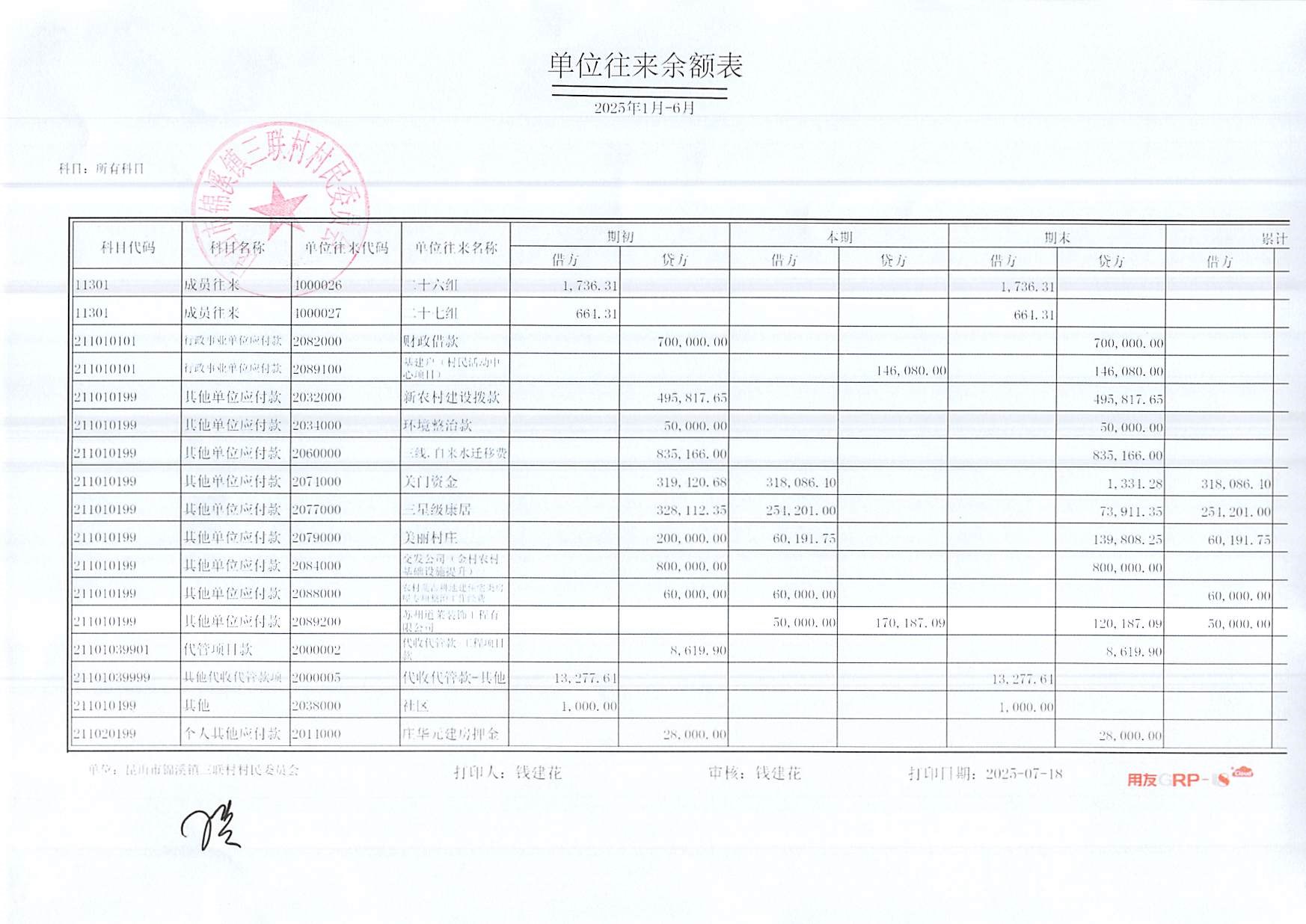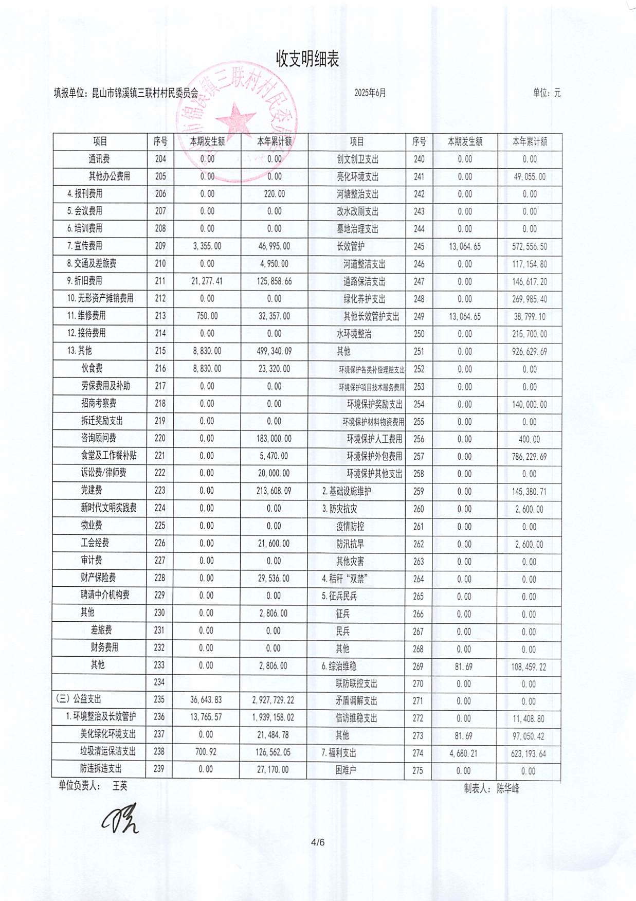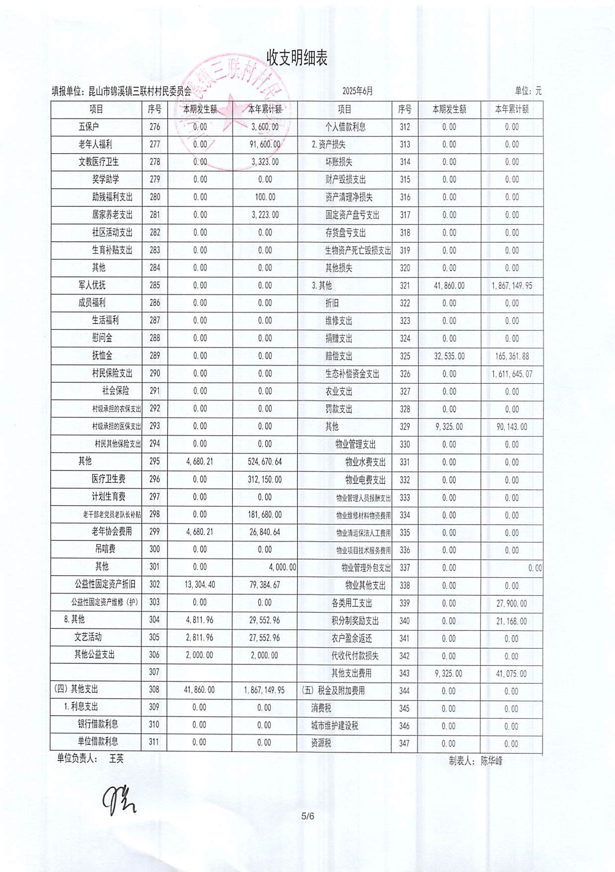 2025年三聯(lián)村村委會6月份財務(wù)公開