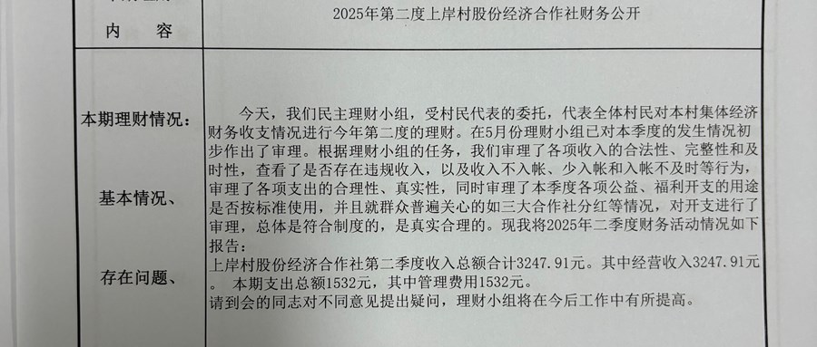 2025年上岸村股份經(jīng)濟(jì)合作社第二季度民主理財(cái)