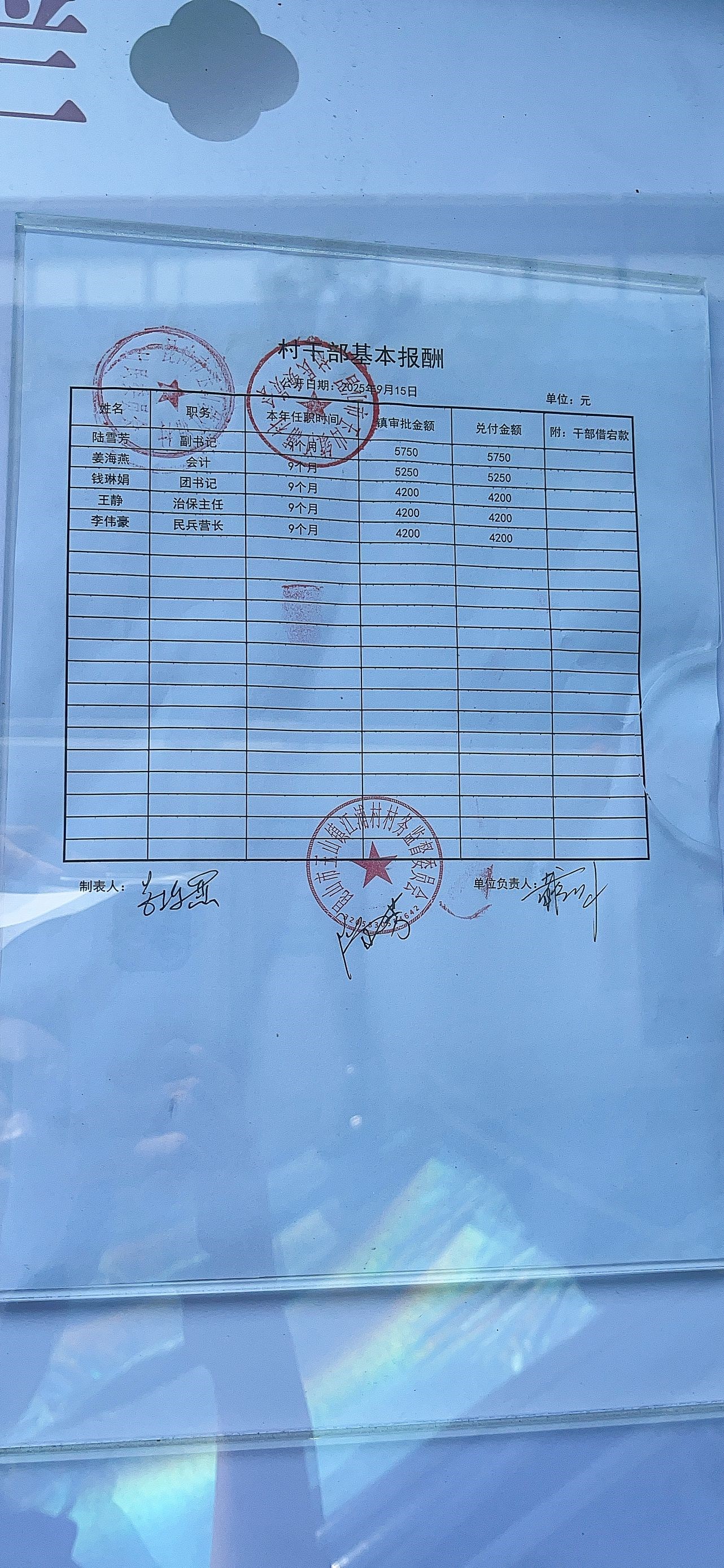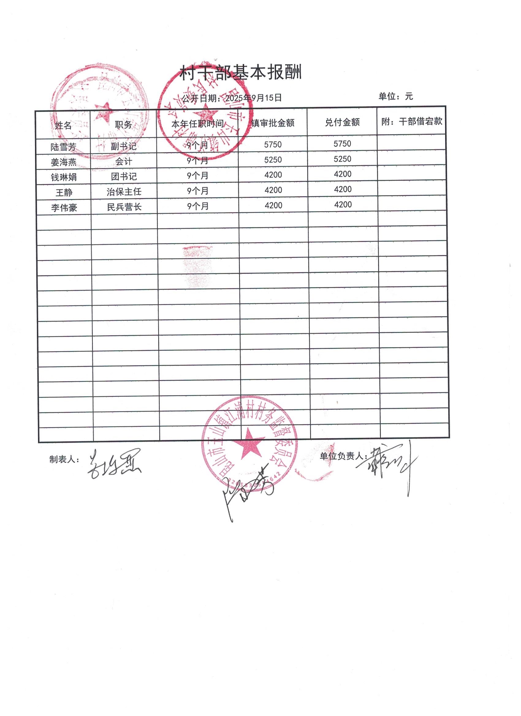 2025年9月份江浦村村干部基本報(bào)酬及公示照片