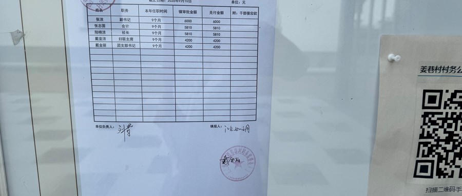 姜巷村2025年9月份財務(wù)公開(村干部基本報酬類)