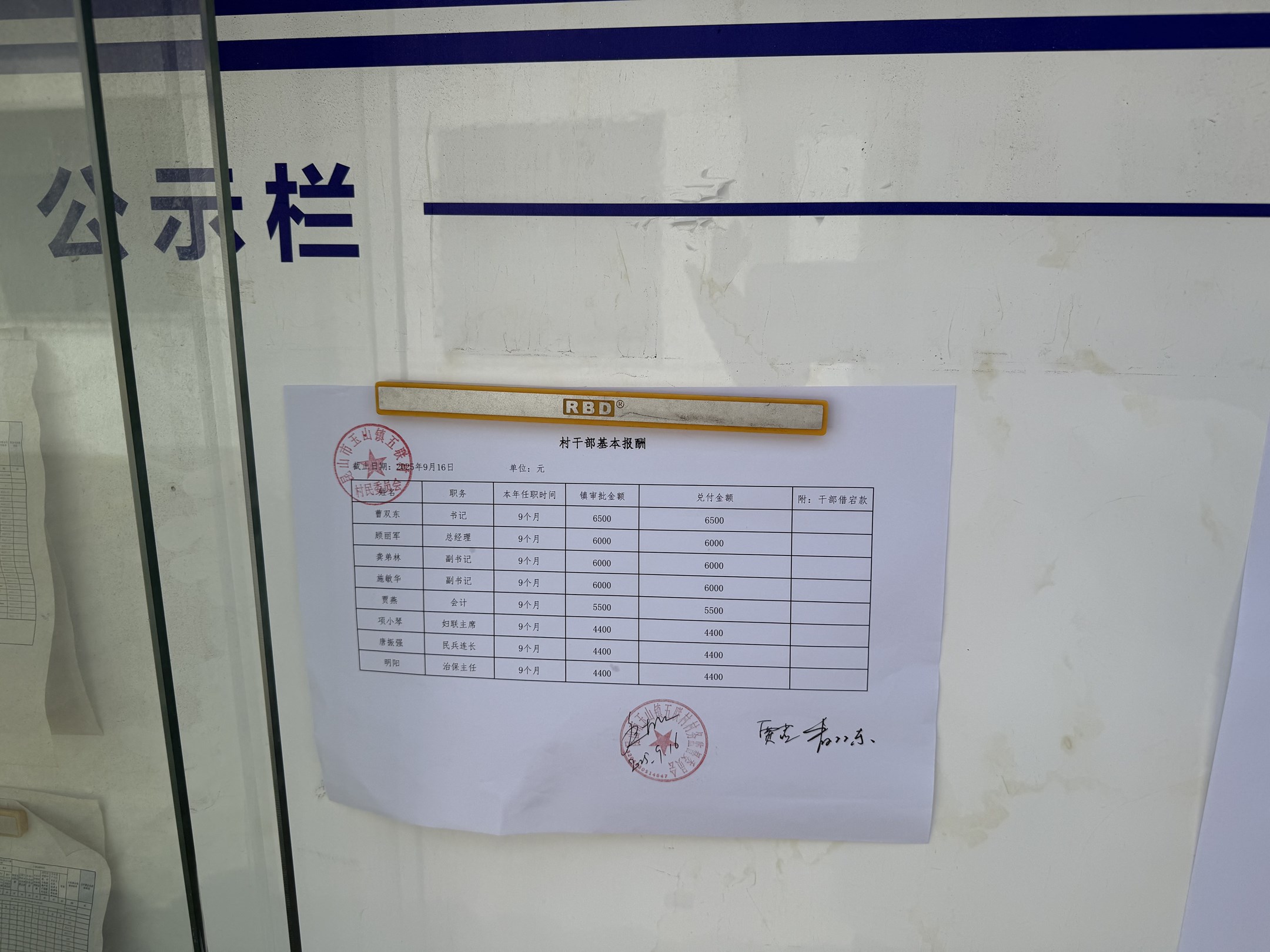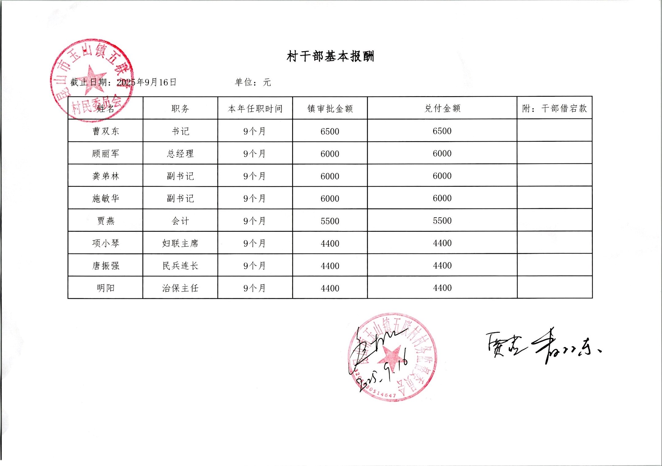 2025年9月份村干部基本報酬公開