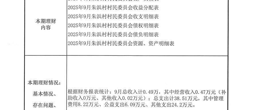 2025年朱浜9月份財(cái)務(wù)公開資料