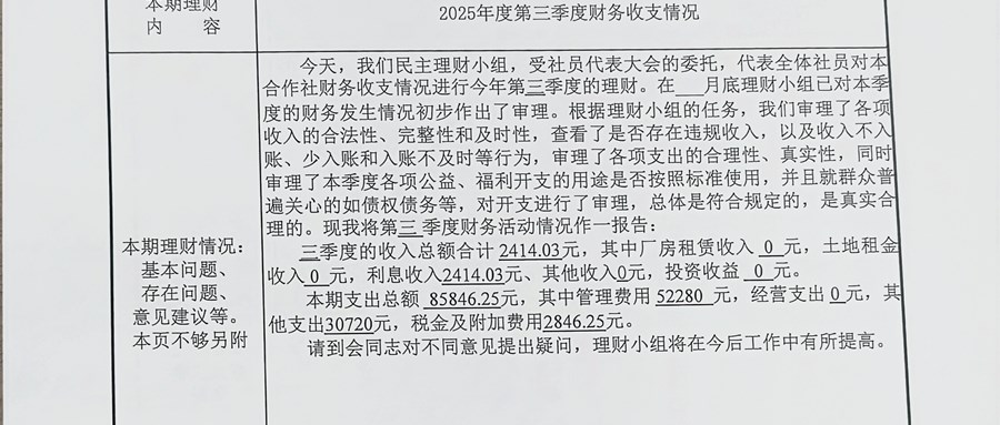 星浜村股份經(jīng)濟(jì)合作社2025年度第三季度民主理財(cái)